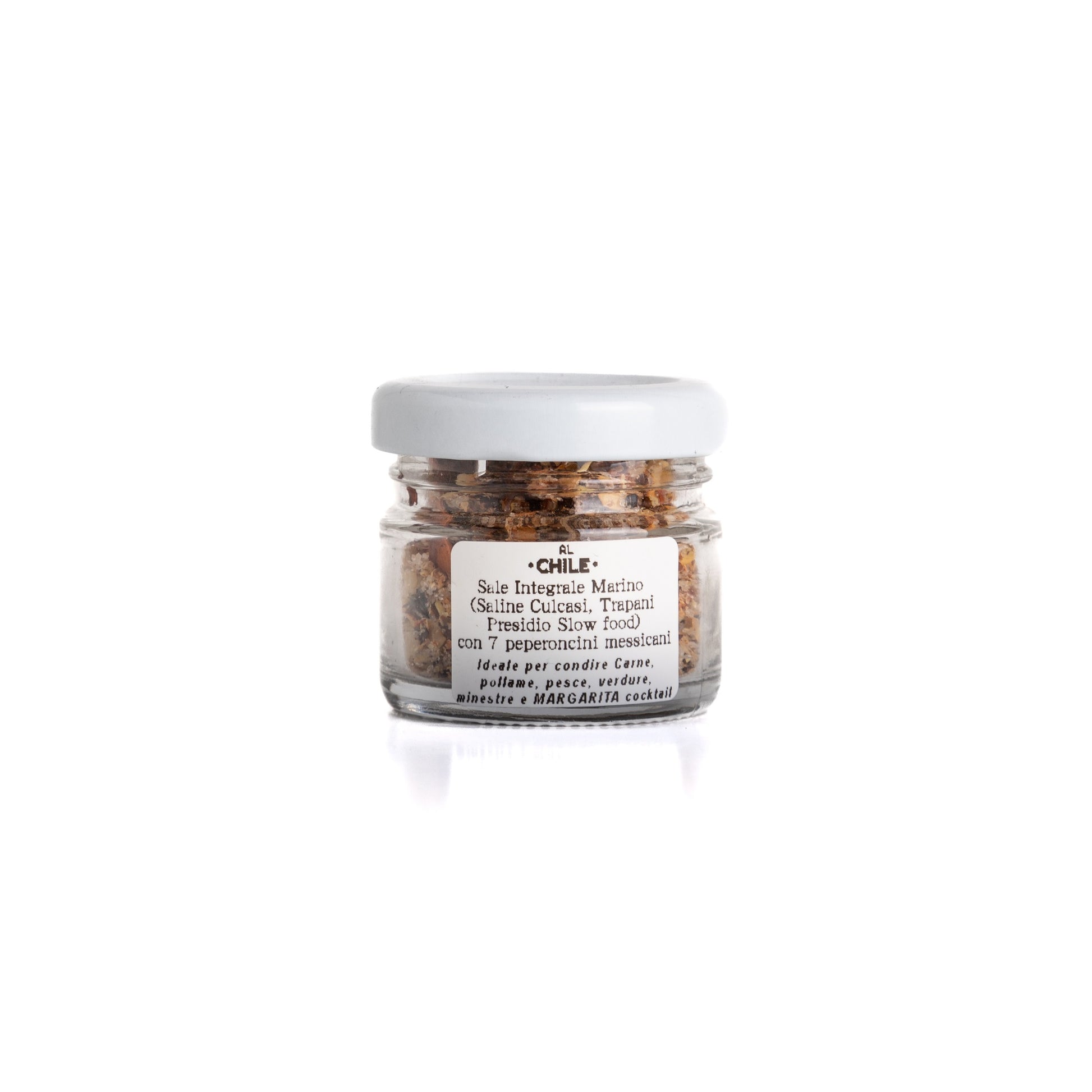 Polvere di peperoncino Jalapeño coltivato in Piemonte, con succo di lime disidratato e sale marino integrale Saline Culcasi di Trapani (Presidio slow Food). PICCANTE 5/10